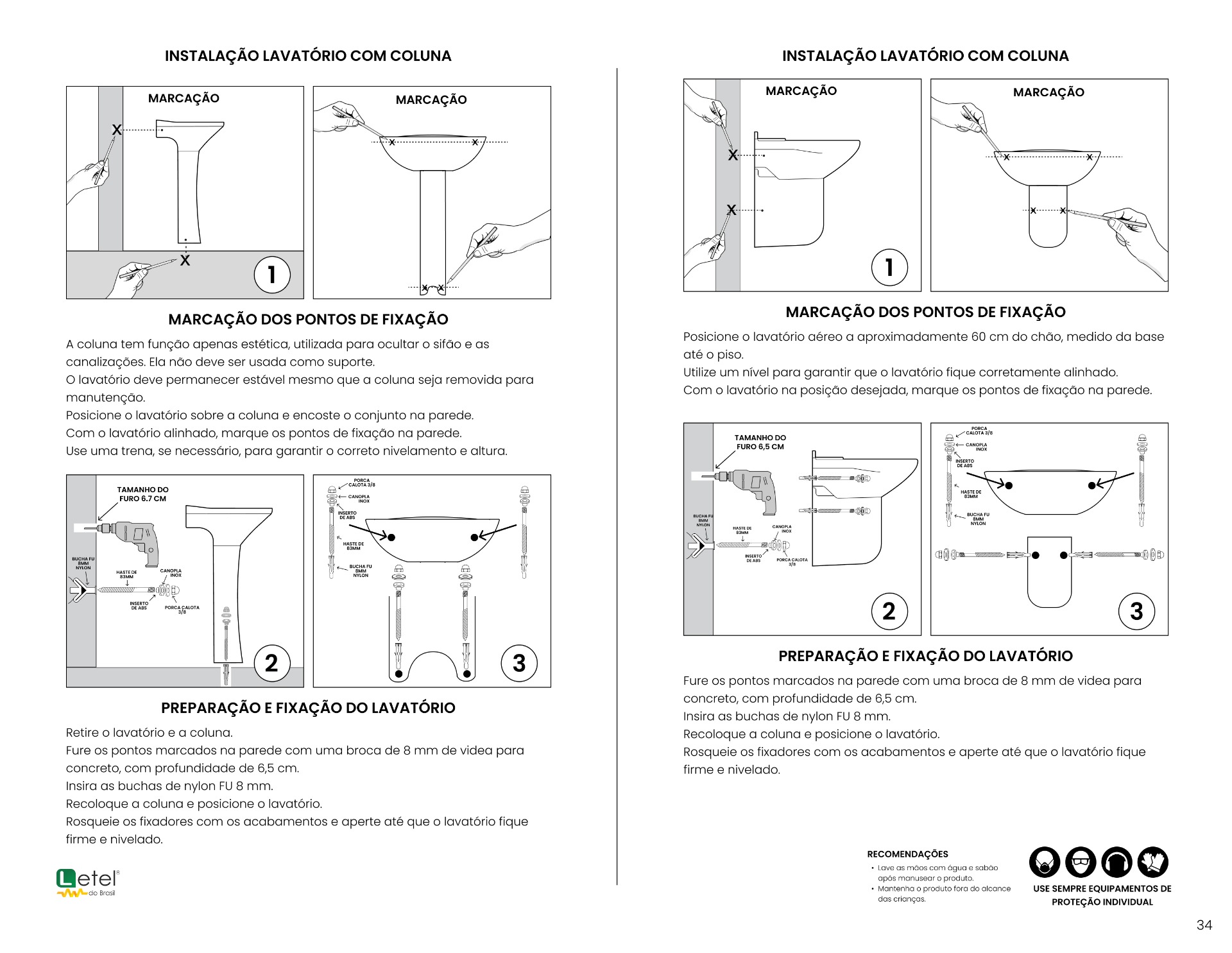 FIXALAVATÓRIO C/COLUNA E SEM COLUNA INOX AISI 304-L - REF. CLT 7.01